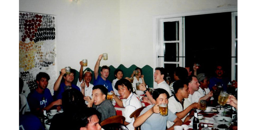 Al snel gaat het over de trip naar Vietnam. Ze zijn het erover eens dat er sindsdien niet meer zo hard is gezopen op clublustrum. De hele tijd gaat het gesprek over Bie-a-hoi’s, met bierpullen bezaaide restaurantvloeren, meisjes uit de bediening die flesjes bier aftrokken en de 48 uur non-stop drinking waar de hele reis mee begon. Als ik hen vraag wat het hoogtepunt van de reis was, zeggen ze in corps “waterpuppet show”. Als je dat niet hebt gezien, ken je Vietnam niet, beweert Onno. Lyrisch is hij over ambiance in de zaal, het enthousiasme van alle bezoekers en vooral de strak gecoördineerde choreografie. Een van hun clubgenoten schijnt nog dagelijks de tapes met de muziek van de show af te spelen. Wat ze tegen vonden vallen was het eten. “De godganse dag vis en koriander, om kotsmisselijk van te worden” zegt Aart. Mochten ze de trip nog eens over doen, dan zouden ze zeker langer blijven hangen in de pisbakken-karaoke-bar en hadden ze de nichtjes van hun gids HIV zeker niet geweigerd in de bus van Hanoi naar Hué. Onno, die destijds in de lustrum-cie zat legt uit dat ze een perfecte balans hadden gezocht tussen zuipen, cultuur en sportief. Dat ze met 10-1 zijn ingemaakt tijdens een potje voetbal, doet blijkbaar niets af aan de lol die ze er aan hebben beleefd. Dat een van hun clubgenoten na een duikongeluk eruitzag als een opgeblazen pufferfish en overduidelijk chagrijnig was, interesseerde hen blijkbaar geen reet. Cultureel hoogtepunt was het schieten met M-16’s en M-60’s en bovenop tanks klimmen. “Dat geeft je toch echt een gevoel van wat die mannen hebben meegemaakt toen” zegt Aart.